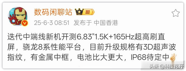 爆料达人数码闲聊站透露:迭代中端线新机开测6.83英寸1.5K分辨率+165Hz超高刷直屏,骁龙8系性能平台……